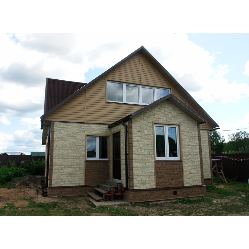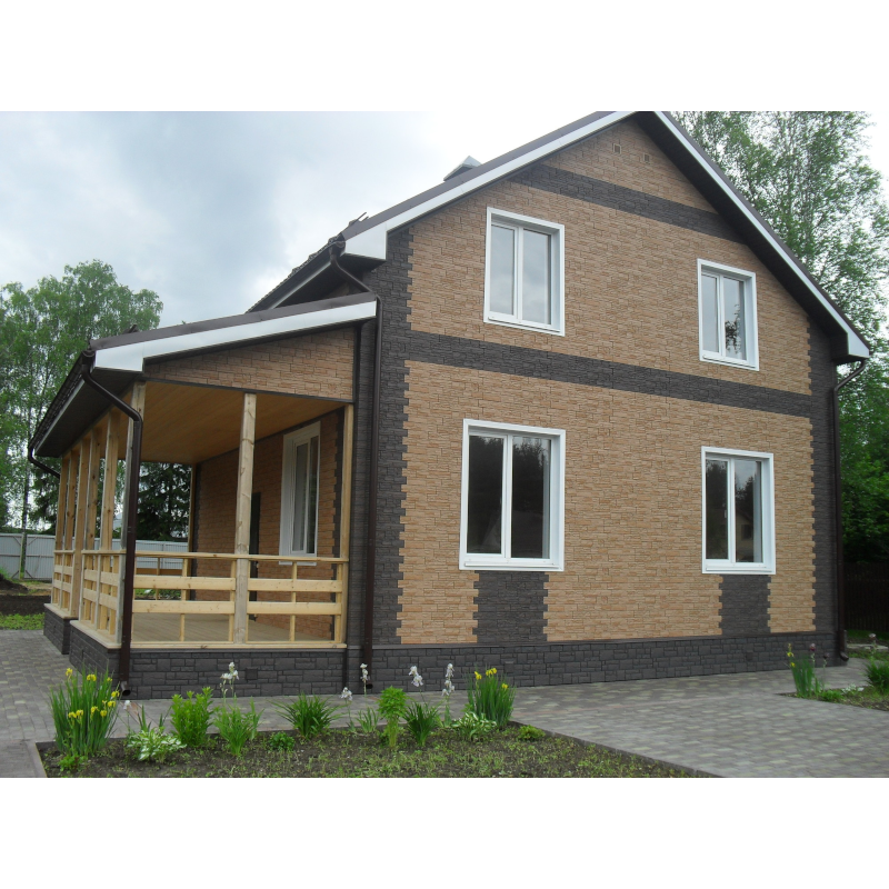 Фасадные панели могут использоваться как для оформления фасада целиком, так и для облицовки фундамента, выделения отдельных деталей.