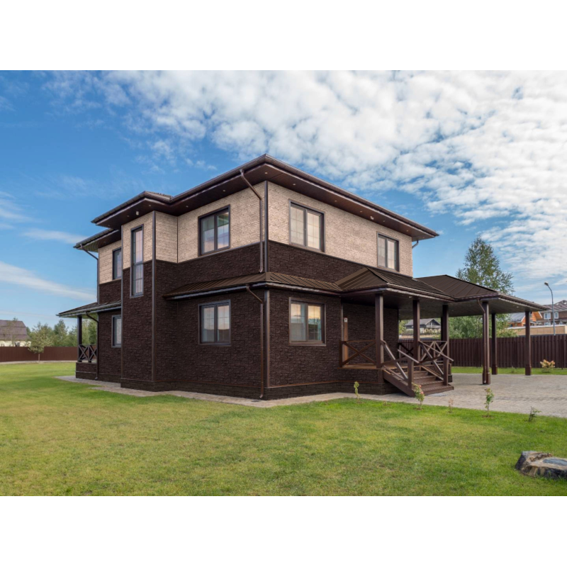 Фасадные панели могут использоваться как для оформления фасада целиком, так и для облицовки фундамента, выделения отдельных деталей.