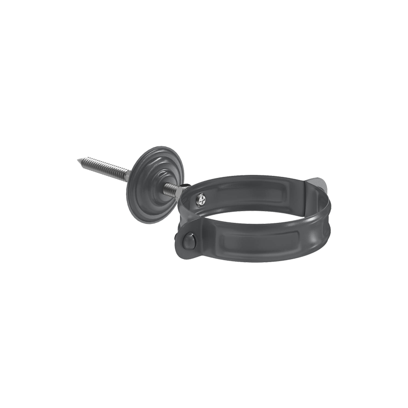 – Хомут трубы с дополнительными ребрами жесткости – надежная фиксация водосточной трубы.