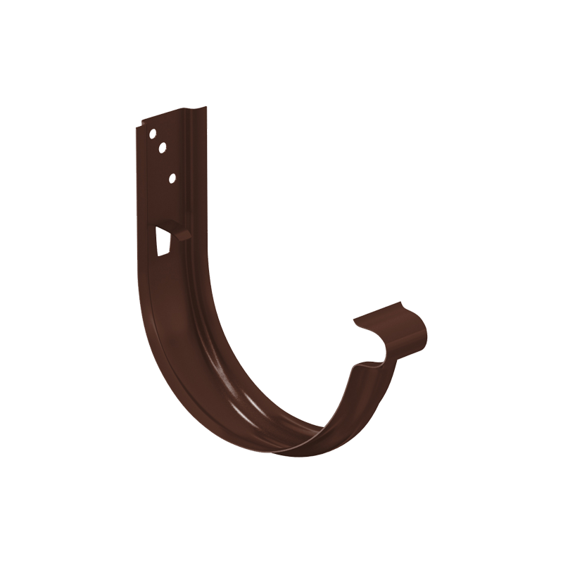 Кронштейн желоба универсальный D125 мм RAL8017 Коричневый с покрытием Полиуретан (PUR) от производителя Аквасистем. Кронштейн используется для фиксации водосточного желоба и монтируется на лобовую доску. Также возможна его установка и без лобовой доски, для этого используется удлинитель крюка.
