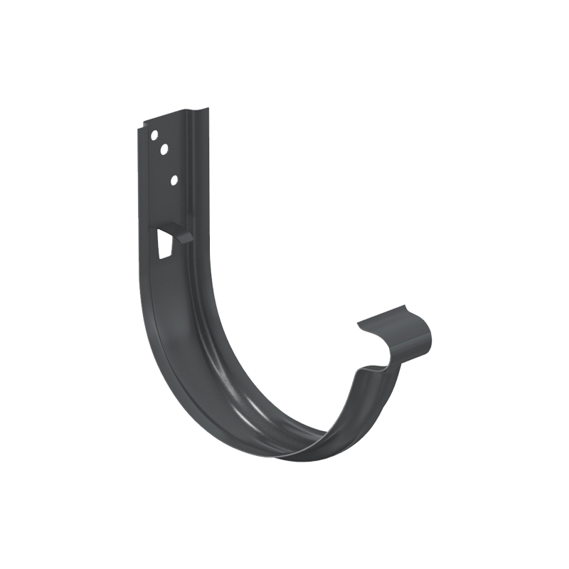 Кронштейн желоба универсальный D125 мм RR23 Маренго с покрытием Полиуретан (PUR) от производителя Аквасистем. Кронштейн используется для фиксации водосточного желоба и монтируется на лобовую доску. Также возможна его установка и без лобовой доски, для этого используется удлинитель крюка.