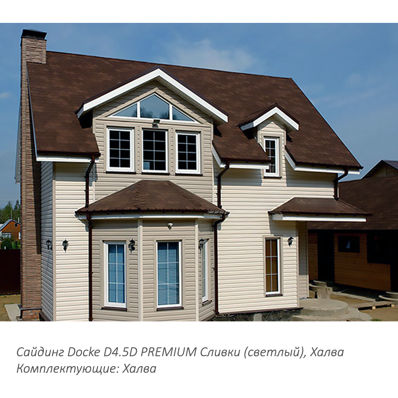 При сочетании фасада, облицованного сайдингом Дёке Премиум цвета «Сливки», с красной, серой, зелёной или синей крышей можно получить классический вариант дома, органично вписывающего в любой окружающий ландшафт. Оригинальным решением станет комбинация сливочного фасада и шоколадной кровли.