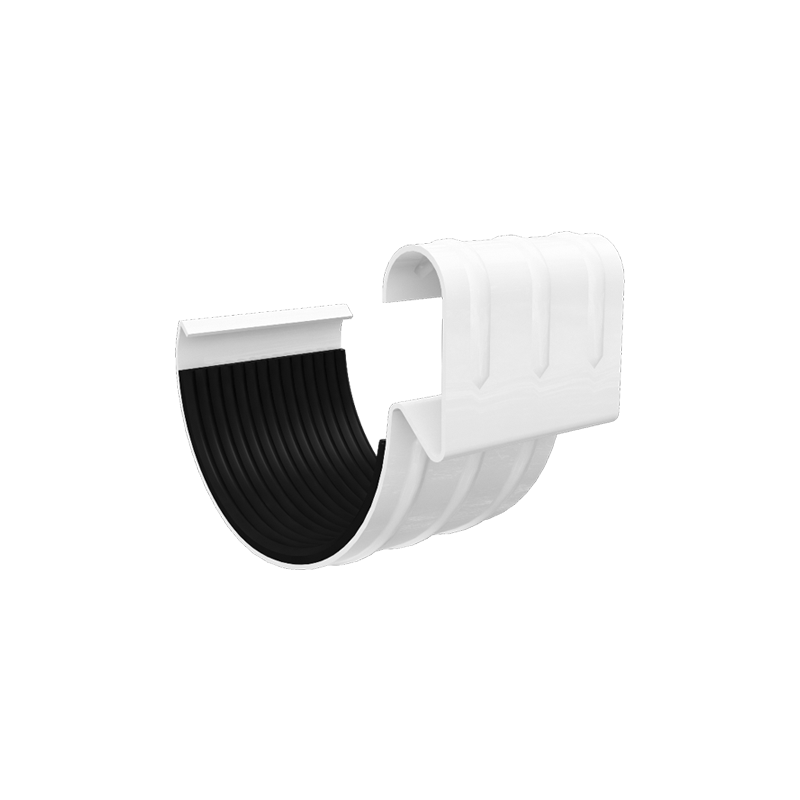 Соединитель желоба с резиновой прокладкой D125 мм белый RAL9010 серии Гранд Систем от Металл Профиль. Устанавливается в местах соединения водосточных желобов, используется для герметизации стыков и придает дополнительную прочность водостоку.