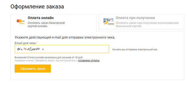 Вы можете оплатить заказ при получении или банковской картой онлайн. Выберите подходящий вам вариант из верхних вкладок, заполните необходимые поля и нажмите «Оформить заказ».